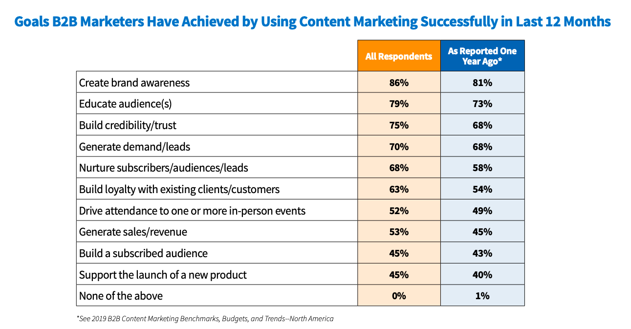 Det viser content marketings potentiale og anvendelighed. Det kan hjælp med at opnå alt fra forøget brand awareness til at generere omsætning, men et andet punkt, som det kaster lys over, er, at det er vigtigt at have klare mål, når man arbejder med content marketing. Selvom det er brugbart for mange ting, er det vigtigt at have en klar ide om, hvorfor man gør det.